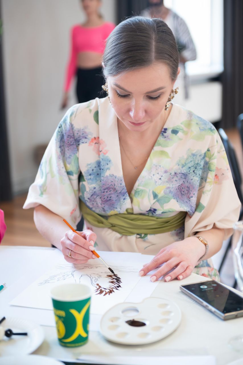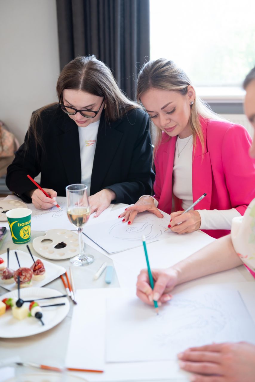 Під час майстер класу з малювання, який проводила Наталія Ситник – сімейна арт-терапевткиня, авторка книг та творчих проєктів, майстриня технік інтуїтивного малювання, казкотерапевтка і експертка видавництва “Колесо Життя”, жінки малювали птахів фарбами на основі духмяної запашної кави. Задача була збалансувати стан свідомості та тіла, знизити рівень стресу, проявити особисті ресурсні якості, відчути опору та підтримку, вийти на ресурсні дії. Деякі учасниці навіть отримали підказки, який рух тілом стане для них мотивацією або підтримкою. Хтось навіть спробував…